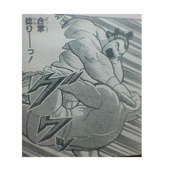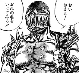 胸にある七つの傷を見せつけながら「俺の名を言ってみろ」と強引な質問をする荒業。
