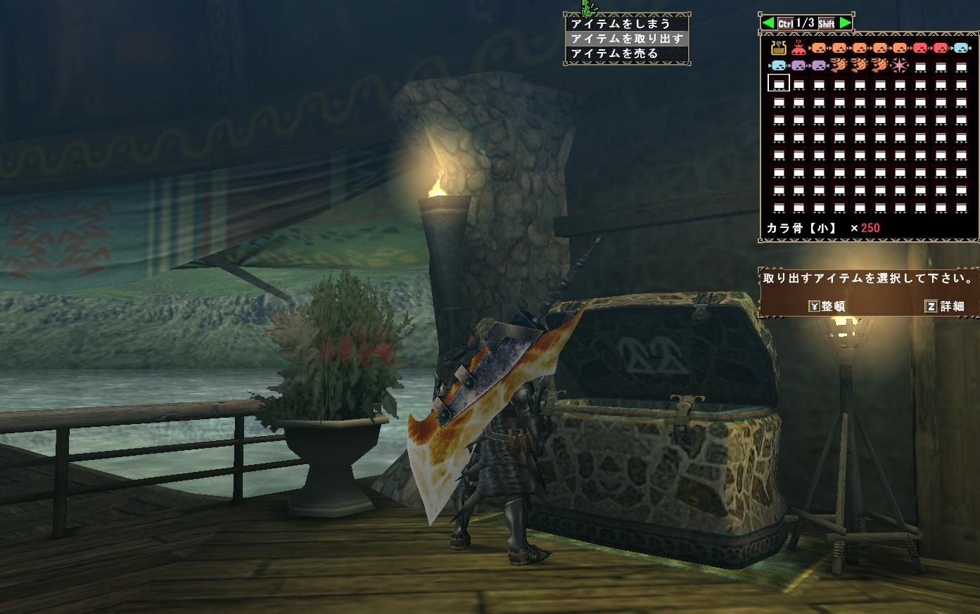 良かれと思い、1回で99個しか持てないカラ骨を自分のアイテムBOXから猟団BOXへ汗水たらしながらせっせと運び込んでいるスロウスの姿を想像すると頭ごなしに怒るのも気が引けてくるな・・・・今度会ったらひとこと言ってやるか。「汗くせぇから近寄るな」・・と。