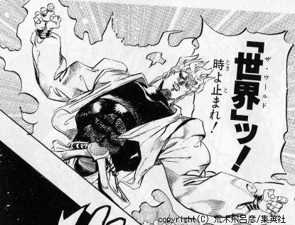 スタンドの力を使い、数秒間「時」を止める技。時間を止めてる間は何をしても気付かれない為、大半の人がシモネタに走ろうとするがここはあえて紳士的な態度でバナナを食うくらいの余裕を見せる事が大切である。ザ・ワールドの効果が切れて「時」が動き出したら女の子に「ごちそうさまでした」とつぶやくのが◎