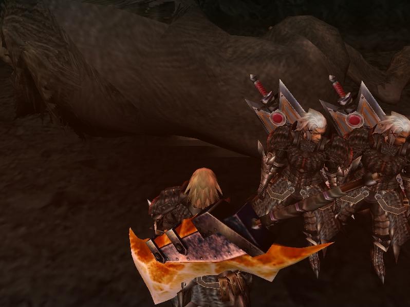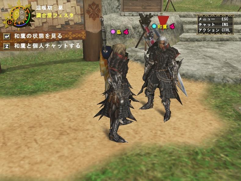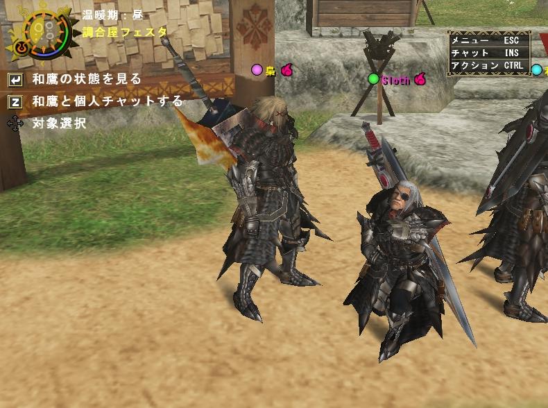 しかし和鷹氏は銀髪だけどパっと見じゃ梟さんと見分けつきづらいねぇ。MHはキャラメイクの時体型とかもいじれないし装備が一緒だったら似た感じになっちゃうのは仕方ないか・・・装備が一緒っていうのもなんか変な感じだな・・・・