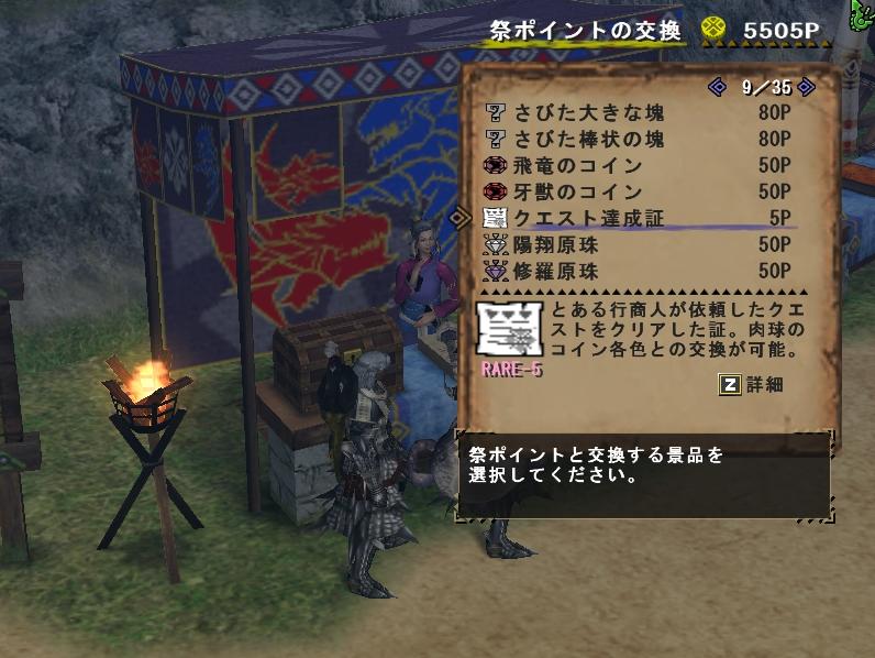 ⑥ そうそう、祭りポイントで達成証を交換しとかないと6月のアップデートから一部の防具強化素材がメモから達成証になっちゃうしね~とかね