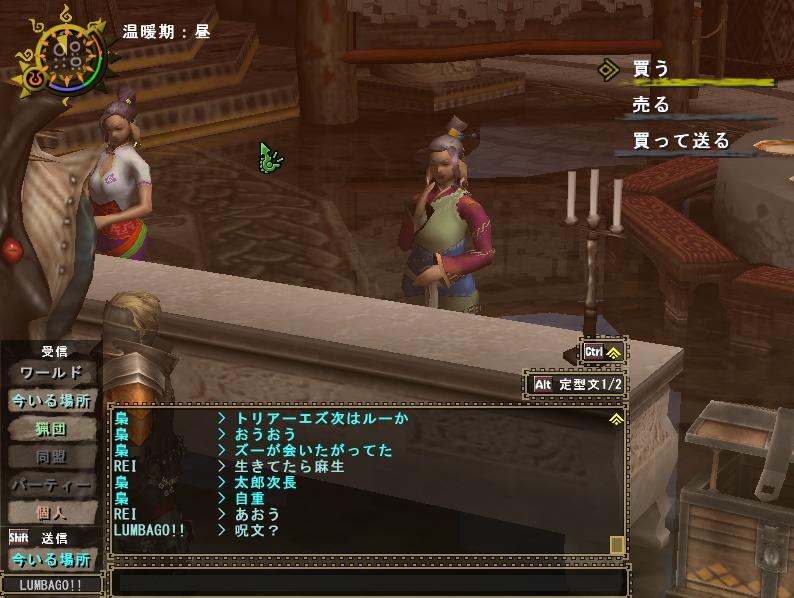 ふらりとドンドルマを来訪した副団長のREI。。相変わらず彼女の「REI語」が理解できるのは梟さんだけである。