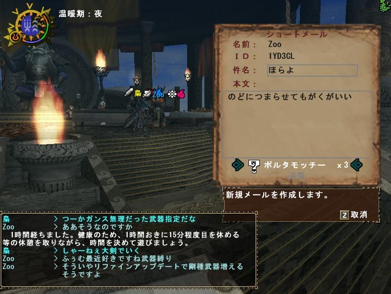 明日は定期メンテの水曜日で剛種チケットクエはヴォルガノスとラージャンかぁ・・まぁまたみんなでコツコツ集めて楽しくやるかね。