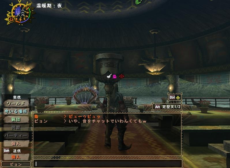 ログインすると団員のピョン君がソロ中である。個人チャットで音+チャット欄を出し狩りを邪魔するのは日常茶飯事・・え?迷惑?ナニソレ塩漬けにして喰らってやるわ