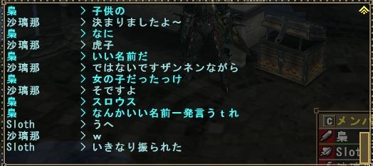 今日は少し遅めにログインしますとスロウスと沙璃那がそれぞれ求人区でシェンとラージャンを狩っておりました。