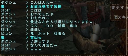 そんな中、団員の他にも梟さんのHR一桁台からのフレ「WILDハンター(仮)」のダクシュも街に訪れ狩りに参加しております。じゃあ今日も行きましょうか恒例の交互貼り
