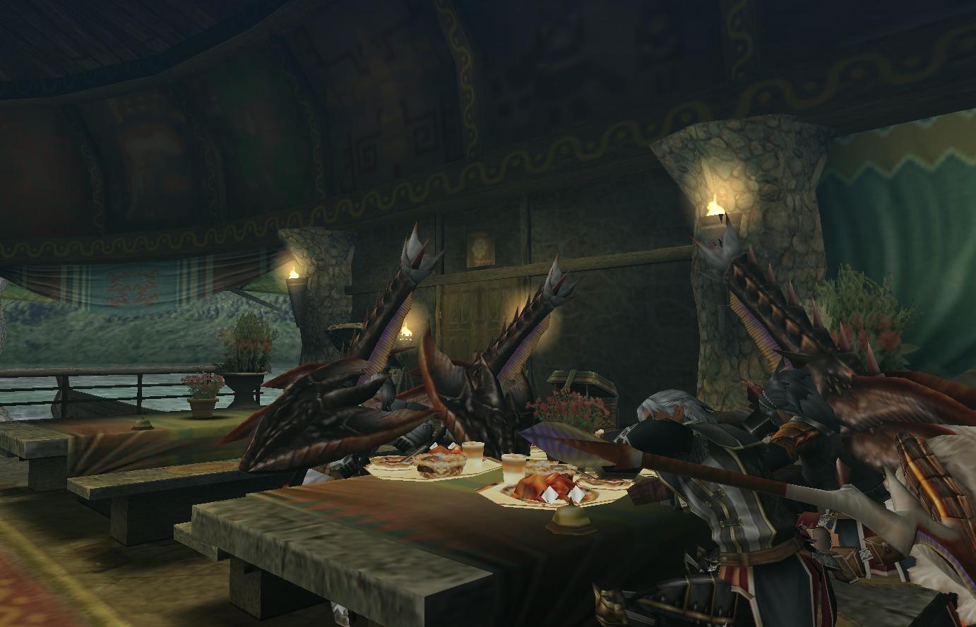 クエスト中ではモンスターが他のメンバーを狙っている隙をぬって食事をとるのがデフォのハンターにとって「自分の腹を満たす」という行為は正に命がけである。弱肉強食の精神でなければメシが食えない・・・そういう悲しい因果を背負っているのである
